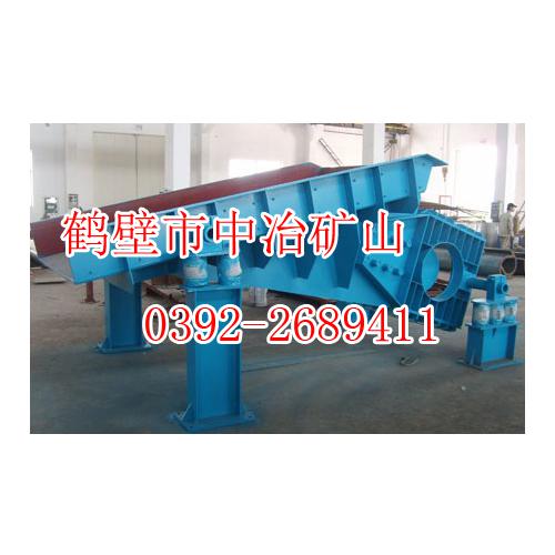 3、工作原理:主振弹簧采用橡胶剪切弹簧,其弹簧上下钢板分别与平衡架(振动电机装在平衡架里)和槽体(通过上下压板)用螺栓连接,主振弹簧牵制激振部平 衡架与槽体在工作时产生的惯性力使给料机在近共振情况下振动,所需激振力小,使给料机使用寿命延长,噪音小,起动停车迅速平衡,另外空车也能平稳运转,可 解除因漏斗放空或卡矿易造成电机损坏的后顾之忧。